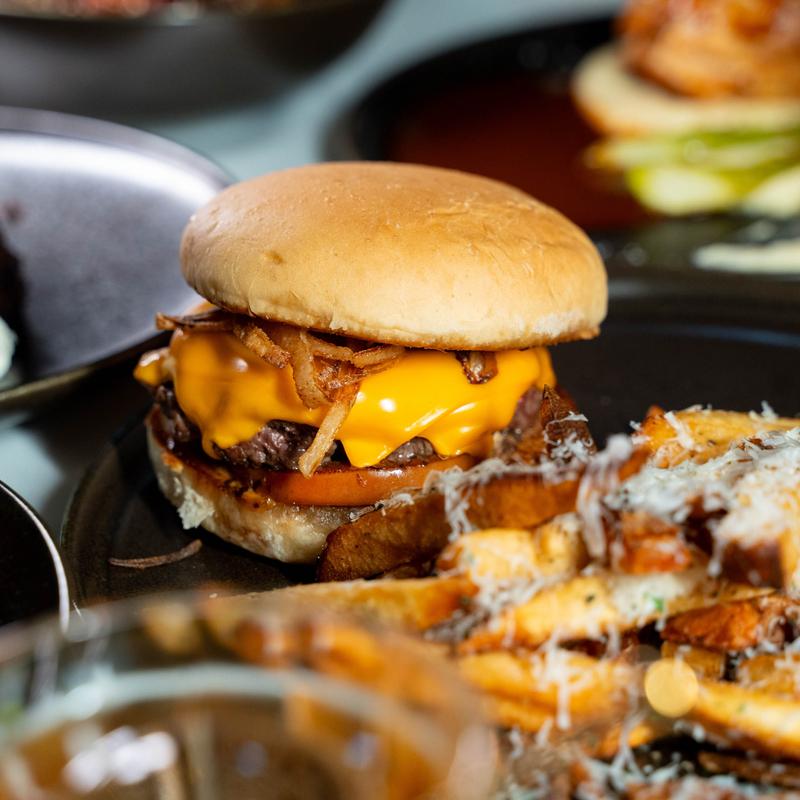 sixteen peaks wagyu, raven signature aioli, gruyere cheese, pickles, crispy onions, parmesan frites, aleppo mustard seed ketchup