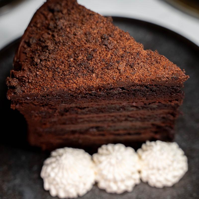 14-layer chocolate cake, soft cocoa butter cream, chocolate ganache